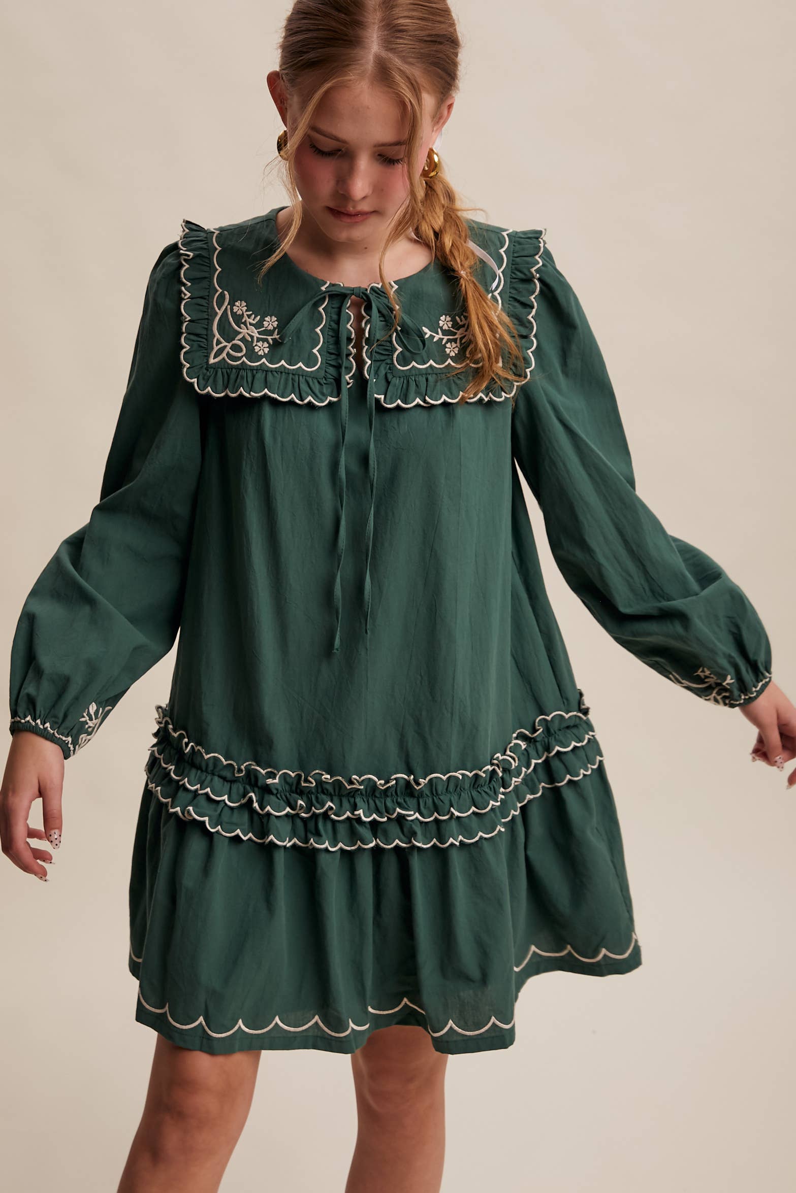 "The grass withers, the flower fades, but the word of our God will stand forever." Isaiah 40:8 - Lightweight Cotton Blend: Made from breathable woven fabric for airy comfort - Oversized Square Collar: Features scalloped edges and floral embroidery with layered ruffle trim - Contrast Embroidery: Ivory-toned stitching along the hem, cuffs, and collar adds a sweet vintage finish - Ruffle Skirt Detail: Gathered tier with dual ruffle layers enhances the feminine silhouette - Puff Long Sleeves: Full sleeves with gentle volume and elastic cuffs for a soft, billowy shape - Functional Details: Includes side pockets and full lining for comfort and convenience - Model is 5'7" 30-24-34.5 and wearing a size Small Romantic and whimsical, this embroidered mini dress pairs nostalgic charm with modern ease. Whether you're styling it for a weekend picnic or dressing it up with Western boots, it captures the playful spirit of Lace Dresses, Boho flair, and trending Romper Dress energy-all in one cottagecore favorite.