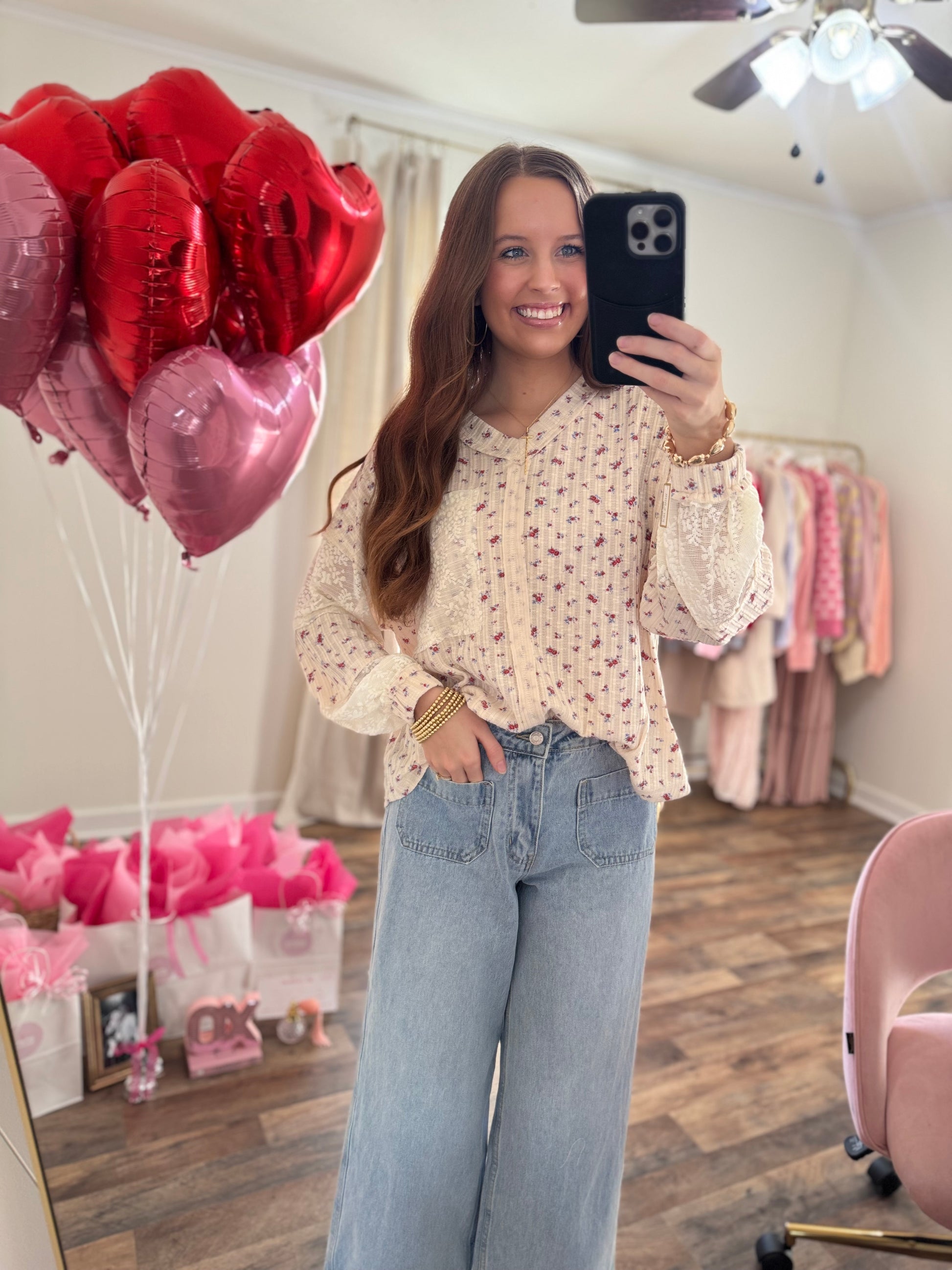 "Weeping may stay for the night, but joy comes in the Morning." Psalm 30:5 - Women's knit floral print lace floral trim contrast pocket and sleeve top. A bit oversized for comfort. Model is wearing the Small, it fit pretty true to size with some room!
