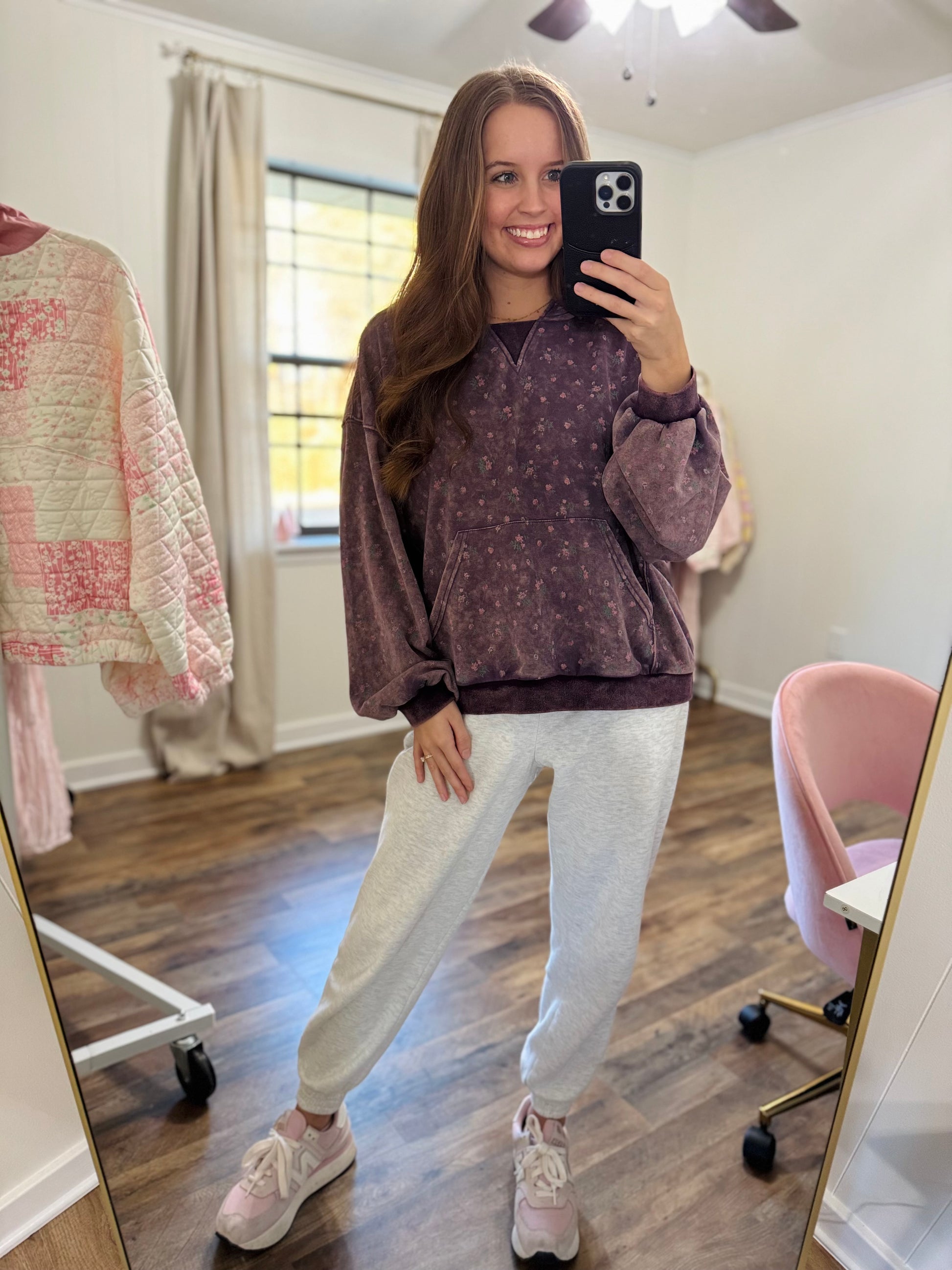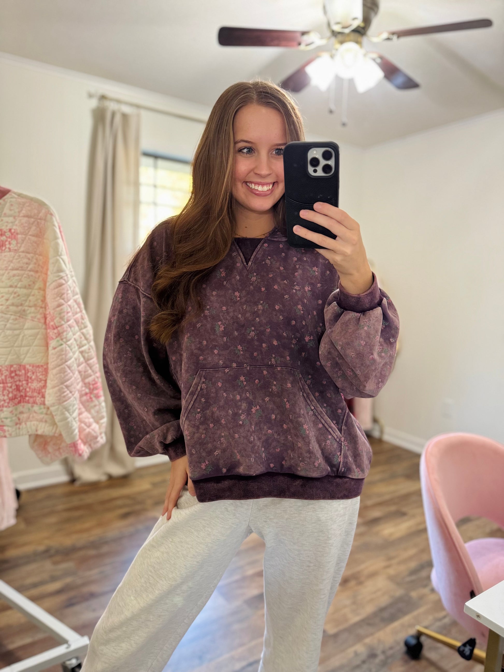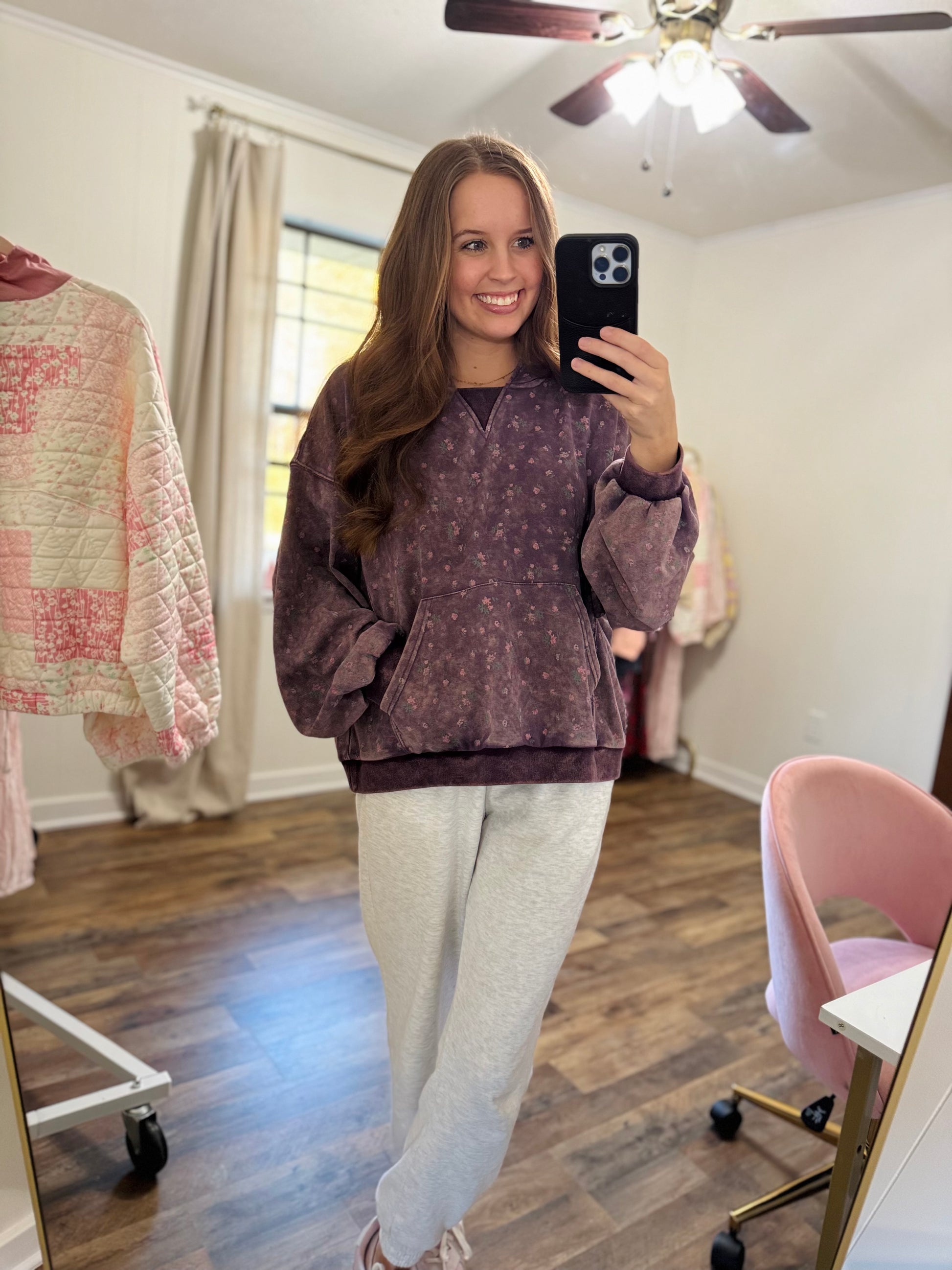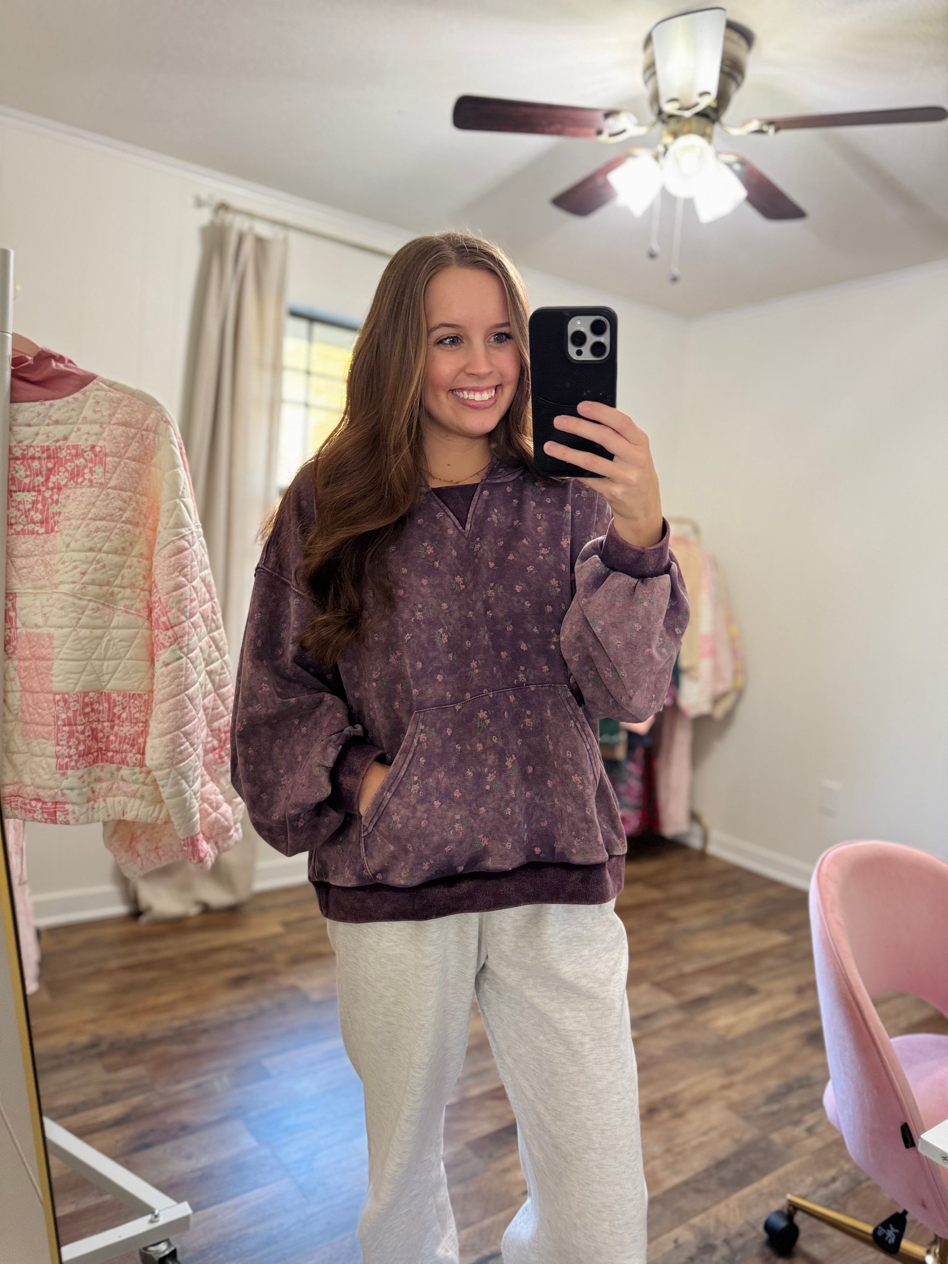 "He lifted me out of the slimy pit, out of the mud and mire; He set my feet on a rock and gave me a firm place to stand." Psalm 40:2 - Running true to size!!!! Model is wearing the Large (She likes sweatshirts to be big on her;) - FLORAL PRINT KNIT FABRIC - HOOD - RIBBED DETAILS - FRONT KANGAROO POCKET - LONG SLEEVE - BANDED HEM - RELAXED FIT - SELF: 70% COTTON, 30% POLYESTER CONT: 95% COTTON, 5% SPANDEX