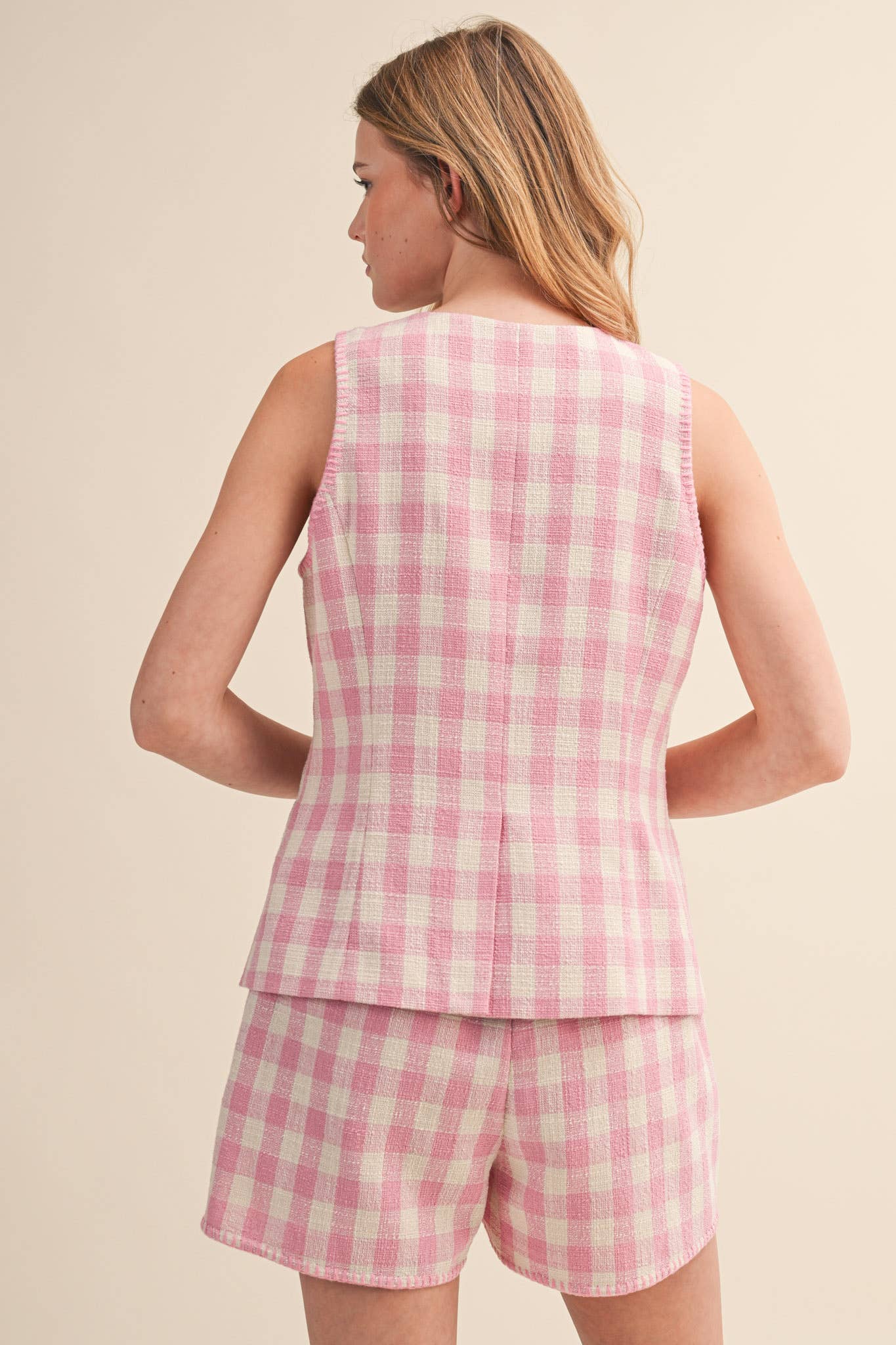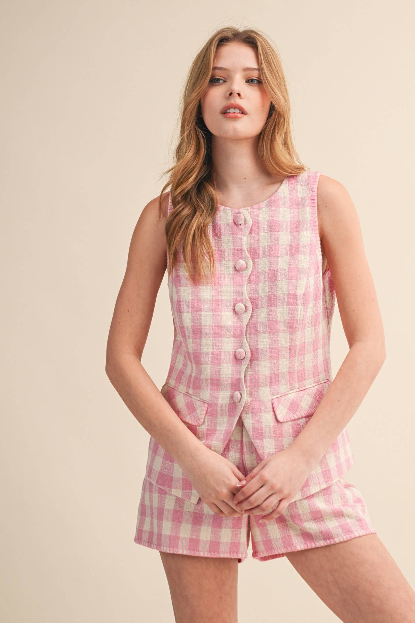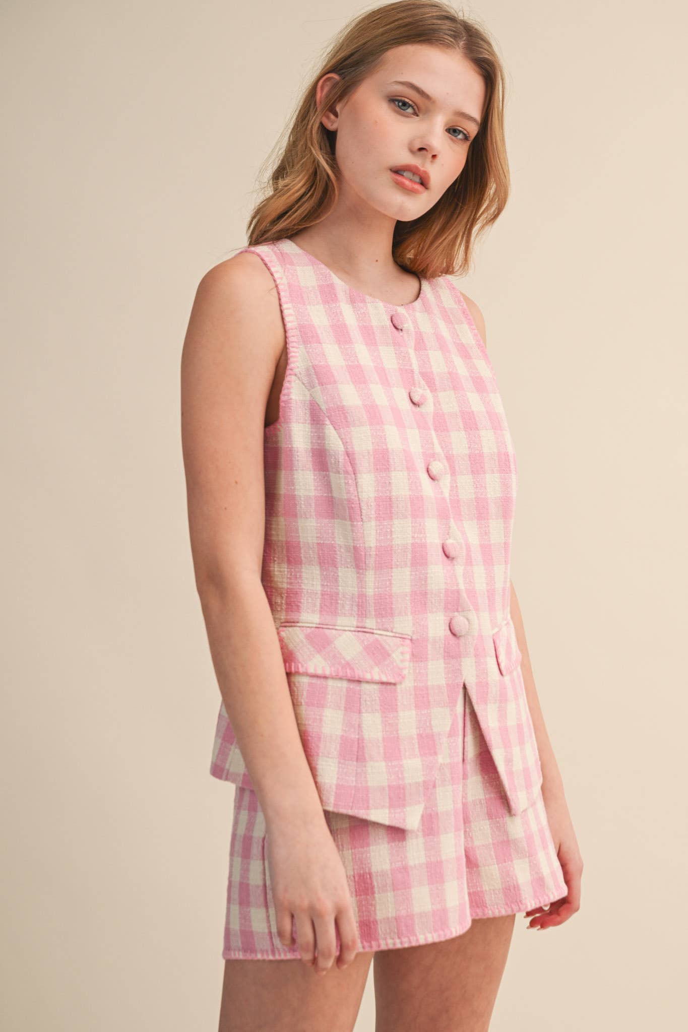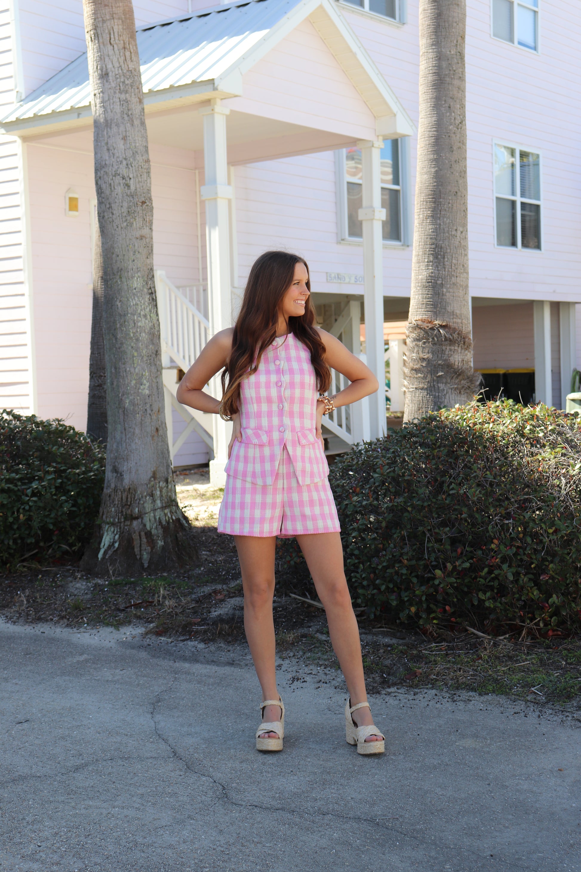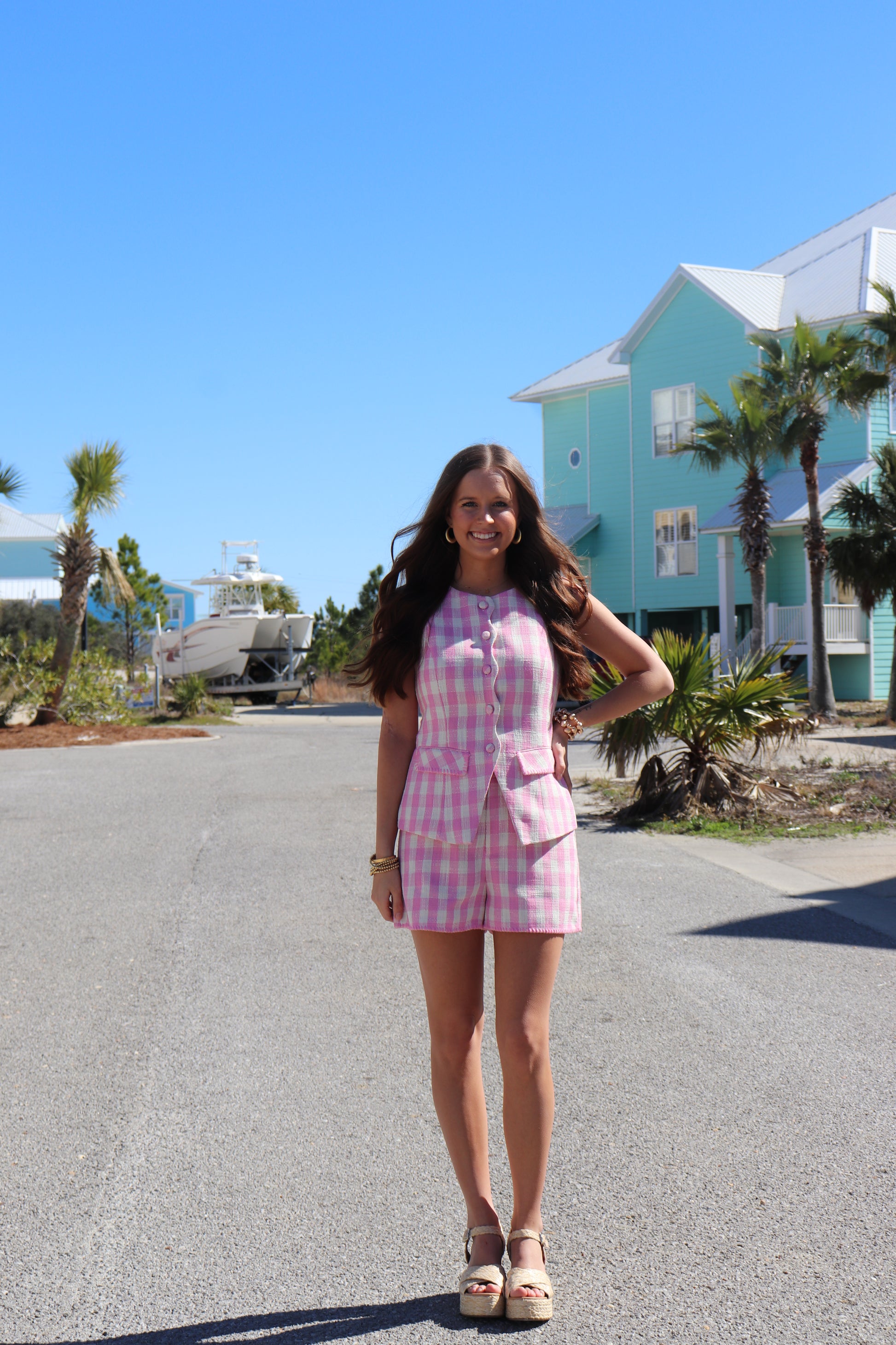 "Keep your heart with all diligence, For out of it spring the issues of life." Proverbs 4:23 (Gingham tweed blanket stitch vest and shorts set + Button up with scalloped edges + Round neckline + Faux flap pockets + Blanket stitch embroidery on shoulders and pockets + High waist with elastic on the back + Front zipper closure + Blanket stitch on hem + Pockets + Lined) THIS OUTFIT IS ADORABLE!!!! Model is wearing the Small and it fit perfect.
