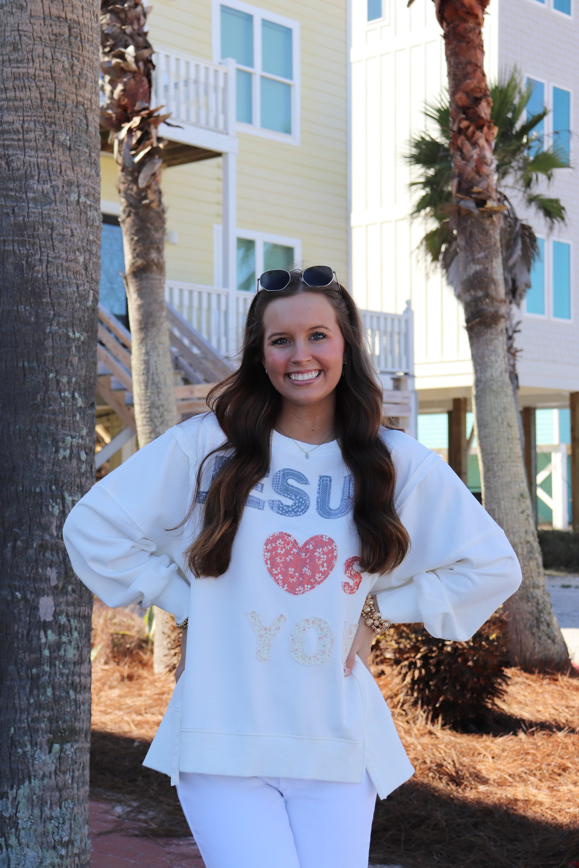 "Taste and see that the Lord is good; blessed is the one who takes refuge in him." Psalm 34:8 (Oversized fit!! Model is wearing the Small!!!) (COTTON FRENCH TERRY KNIT FABRIC - MINERAL WASH - JESUS LOVES YOU LETTERING PATCHWORK - CREW NECK - LONG SLEEVE - RIBBED HEM AND DETAILING - RAW CUT EDGE SEAM DETAIL - SLIT HEM DETAIL - LOOSE FIT - LIGHTWEIGHT SWEATSHIRT)