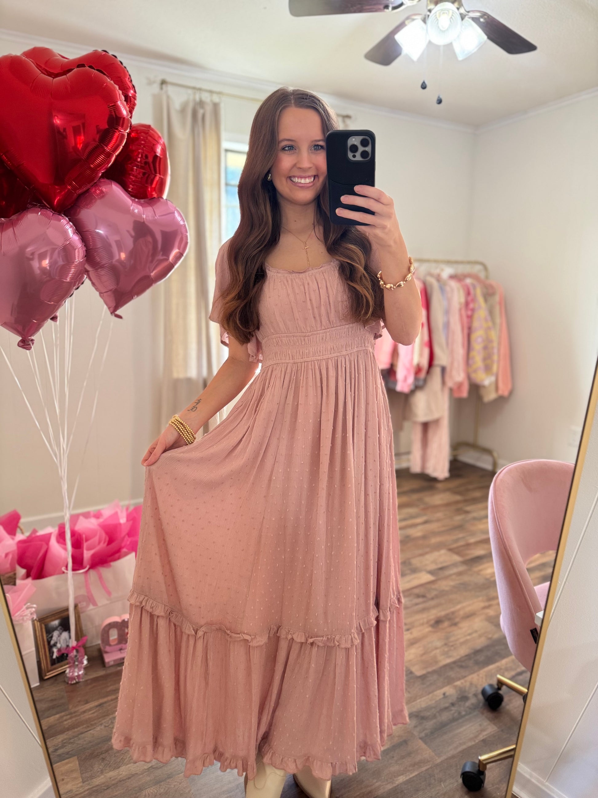 "Let everything that has breath praise the Lord." Psalm 150:6 - THE PERFECT DRESS FOR FAMILY PHOTOSHOOTS! MAXI DRESS FEATURING: - SWISS DOT TEXTURED RAYON FABRICATION - SQUARE NECKLINE WITH RUFFLED EDGES - FLUTTER SLEEVES - ELASTIC RUCHED WAIST - PARTIALLY SMOCKED BACK BODICE - RUFFLED FLOUNCE - SIDE POCKETS - FULL LINING