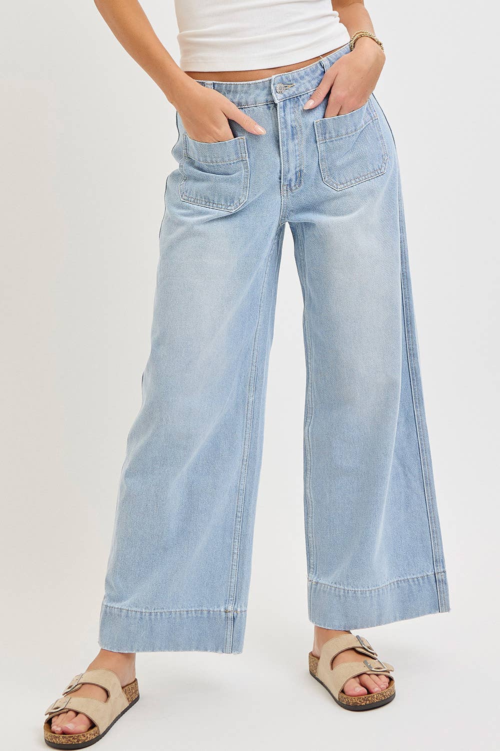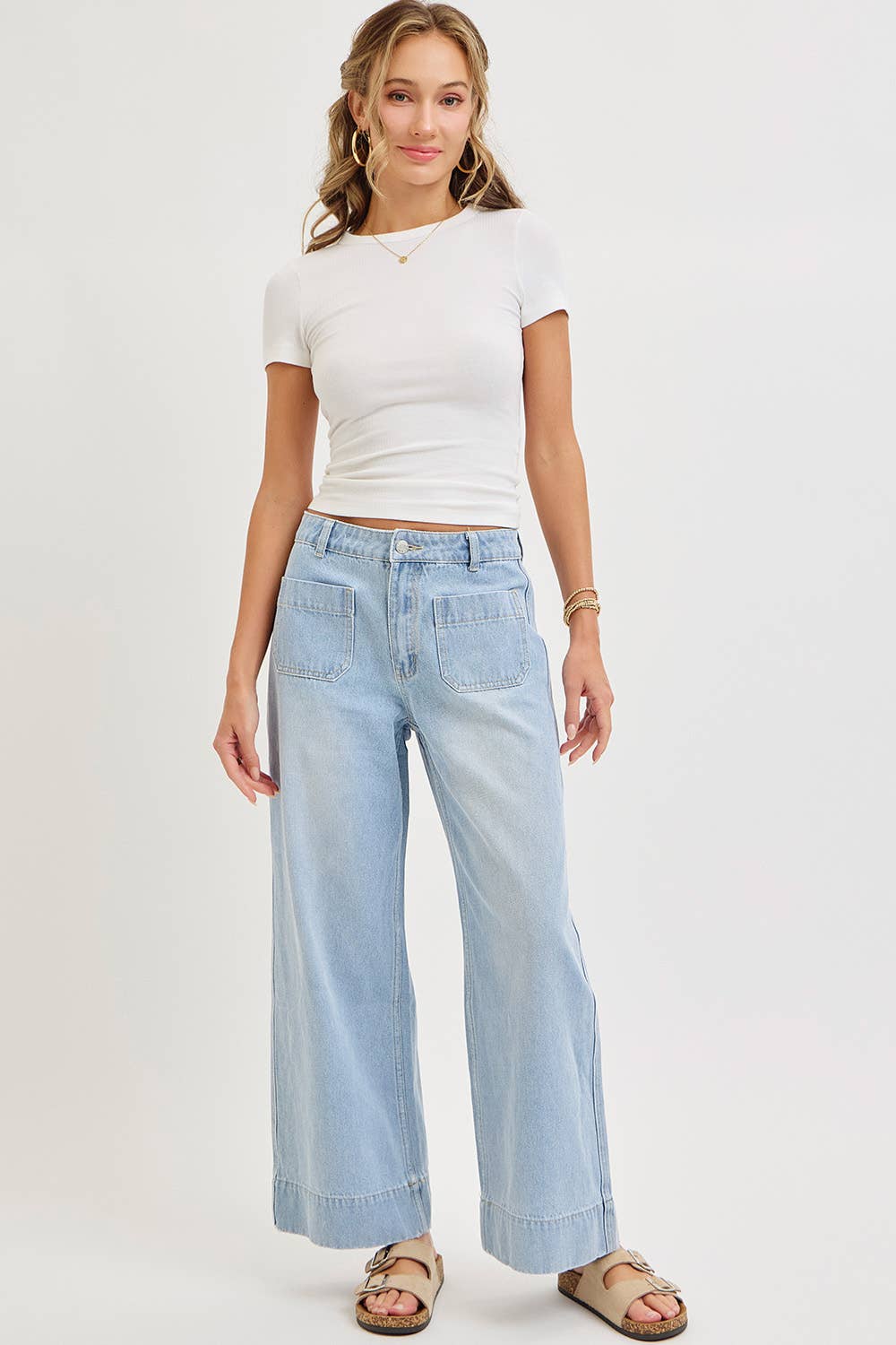 "She is clothed with strength and dignity; she can laugh at the days to come." Proverbs 31:25 (LIGHT WASH DENIM, WIDE-LEG SILHOUETTE, RELAXED, REGULAR FIT FROM WAIST TO HIP AND WIDE CUT FROM THIGH TO HEM. HIGH WAIST AND ZIP FLY WITH BUTTON CLOSURE. *DETAIL* -REGULAR FIT -HIGH/MID WAIST -SIP FLY WITH BUTTON -FRONT TWO PATCH POCKET -BACK TWO PATCH POCKET)
